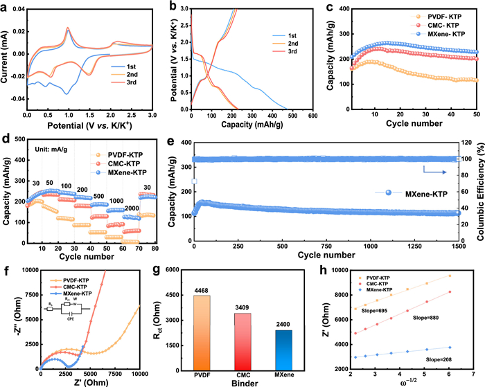 The initial reversible potassium storge capacities of the PVDF-KTP, CMC-KTP, MXene-KTP electrodes are 160.9, 164.7 and 208.9 mAh/g at 50 mA/g, respectively (Fig. 3c). Due to the activation process, the capacities of the electrodes gradually increase in the initial cycles. However, the PVDF-KTP suffers from rapid capacity decay with only 115.5 mAh/g after 50 cycles, while the CMC-KTP electrode also has unsatisfactory cycle stability with 200.4 mAh/g after 50 cycles. By contrast, the MXene-KTP electrode delivers superior cycle performance, which exhibits a capacity of 228.3 mAh/g after 50 cycles. The enhancement of capacity and cycle performance is ascribed to the 2D MXene binder that can both facilitate electron transfer and buffer the volume change of the KTi2(PO4)3 particles. The rate performance further highlights the superiority of MXene-KTP, which shows the capacities of 221.5, 184.2, 155.8 mAh/g at 200, 500, 1000 mA/g, respectively (Fig. 3d). Even at the high current density of 2 A/g, the capacity can still maintain at 126.9 mAh/g, much higher than that of PVDF-KTP (7.8 mAh/g) and CMC-KTP (55.0 mAh/g) electrodes. Fig. 3e reveals the long-term cycle performance of the MXene-KTP electrode, which possesses an initial capacity of 113.2 mAh/g at 1 A/g that increases to 156.8 mAh/g after the activation process, and remains at 114.3 mAh/g after 1500 cycles. The outstanding cycle and rate performance is attributed to its excellent conductivity and structural stability originated from the 2D MXene nanosheets with metallic-like electronic conductivity and high mechanical strength as a conductive binder.