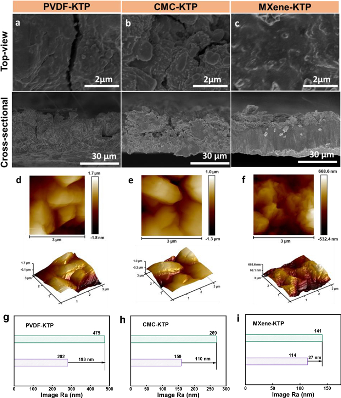 | Fig. 4. Morphologies of the cycled KTi2(PO4)3 electrodes. Top-view and cross-sectional SEM images of (a) PVDF-KTP, (b) CMC-KTP and (c) MXene-KTP; AFM images of (d) PVDF-KTP, (e) CMC-KTP, and (f) MXene-KTP; Roughness difference of (g) PVDF-KTP, (h) CMC-KTP and (i) MXene-KTP. | |