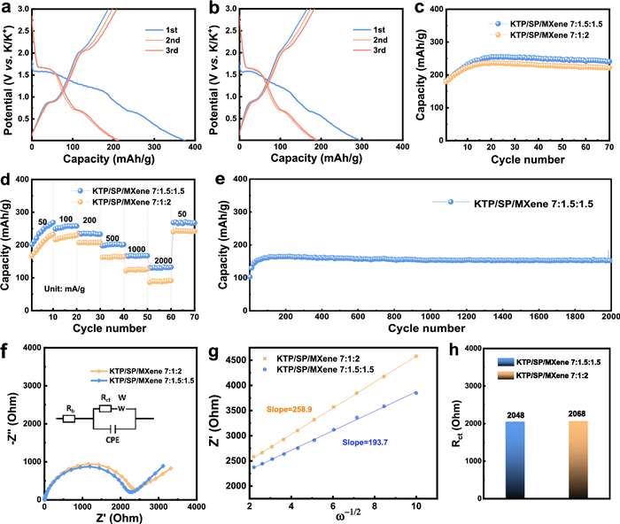 As expected, the KTP/SP/MXene 7:1.5:1.5 electrode displays superior long-term cycle stability at a high current density of 1 A/g (Fig. 5e). It shows an initial reversible capacity of 103.2 mAh/g that gradually increases to 161.1 mAh/g due to the activation process, and maintains at 151.6 mAh/g after 2000 cycles, corresponding to a capacity retention of ~94.1% (compared with the maximum capacity after activation), which is attractive among the potassium storage anode materials when compared with the previously reported literatures (Table S2 in Supporting information). Based on the EIS plots (Fig. 5f), the potassium-ion diffusion coefficient of KTP/SP/MXene 7:1.5:1.5 is calculated to be 1.2 × 10−11 cm2/s (Fig. 5g), and its Rct value is 2048 Ω (Fig. 5h). It means the KTP/SP/MXene 7:1.5:1.5 has the best charge transfer capability among the MXene-boned KTi2(PO4)3 electrodes, as its appropriate proportion can maximize the function of the MXene in constructing the highly conductive framework for both fast electron transfer and rapid ion transport, and meanwhile realize the "point-to-point" electron transfer of SP particles.
