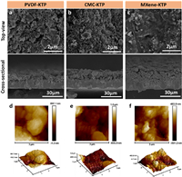 | Fig. 2. Morphologies of the KTi2(PO4)3 electrodes with PVDF, CMC or MXene as a binder. Top-view and cross-sectional SEM images of (a) PVDF-KTP, (b) CMC-KTP and (c) MXene-KTP. AFM images of (d) PVDF-KTP, (e) CMC-KTP, and (f) MXene-KTP. | |