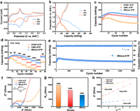 | Fig. 3. Electrochemical performance of MXene-KTP for potassium storage. (a) CV curves at a scan rate of 0.1 mV/s. (b) Charge/discharge profiles at 50 mA/g. (c) Cycle performance at 50 mA/g. (d) Rate capability. (e) Long-term cycle stability at 1 A/g. (f) EIS spectra with the equivalent circuit in the inset. (g) Rct values fitting by the equivalent circuit. (h) Relationship between Z' and square root of frequency ω−1/2 in the low-frequency region of the EIS spectra. | |