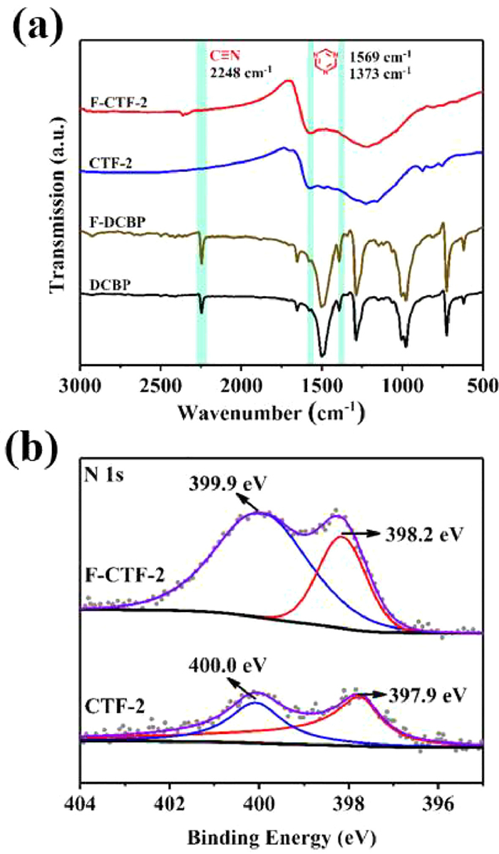 | Fig. 1. (a) FT-IR, (b) N 1s XPS spectra of CTF-2 and F-CTF-2. | |