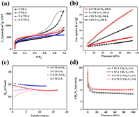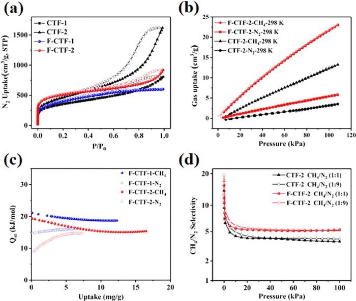 | Fig. 2. (a) Nitrogen sorption isotherms at 77 K. (b) Single-component adsorption isotherms of CH4 and N2 for CTF-2 and F-CTF-2 at 298 K. (c) Qst curves for F-CTF-1 and F-CTF-2. (d) IAST selectivity of CH4/N2 (1:1, v/v and 1:9, v/v) for CTF-2 and F-CTF-2 at 298 K. | |