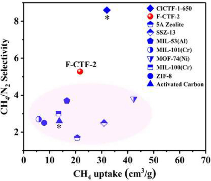| Fig. 3. Comparison of separation performance on F-CTF-2 and other benchmarks (*chemical stability was not studied). | |