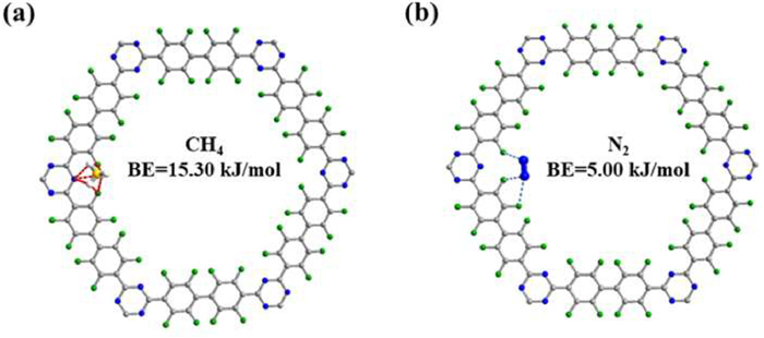 | Fig. 4. Schematic adsorption sites for (a) CH4 and (b) N2 obtained from theoretical calculations. Color code: C, dark gray; H, white; N, blue; F, green. | |