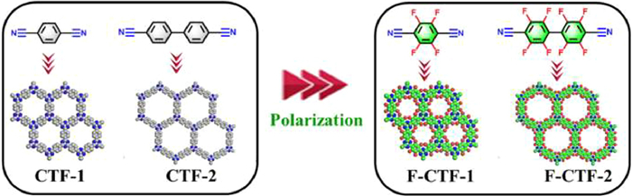 Covalent organic frameworks (COFs), constructed by covalent bonds, are a type of promising porous materials due to their large specific surface area [29], low mass density [30], excellent chemical/thermal stability [31,32] and structural modularity [33,34]. Therefore, COFs is a kind of suitable candidate material for the separation of CH4/N2. Unfortunately, current COFs were rarely reported [35] for methane purification which may be attributed to the lack of efficient constructional strategies. The existing strategy of constructing COF adsorbent for CH4/N2 separation is adjusting the pore size of COFs. Therefore, it is necessary to develop new strategy for constructing COF based adsorbents for CH4/N2 separation. Based on the fact that CH4 (25.93 × 10−25 cm3) has a greater polarizability than N2 (17.40 × 10−25 cm3), we reason that enhancing the polarity of the host framework to form multiple interactions between CH4 molecules and the skeleton would benefit the CH4/N2 separation. Therefore, we proposed a dual polarization strategy by introducing both triazine and polyfluoride sites onto framework to construct polar pores, which would thus enhance the interaction between CH4 molecules and the host framework and thereby achieving the high-efficient separation of CH4 from N2.