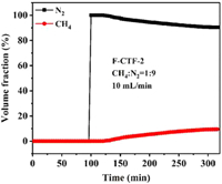 To further confirm the practical separation performance on the CBM with a low CH4 concentration, breakthrough experiment of F-CTF-2 for CH4/N2 (1:9, v/v) was purged into a packed column with a total inlet flow rate of 10 mL/min at 298 K (Fig. 5). During the experiment, N2 firstly penetrated the column before CH4 because of weaker interactions with the adsorbents. Subsequently, CH4 broke through the column after 20 min, which corresponds to a time window of 20 min for high-purity CH4 collection. This separation experiment demonstrated that F-CTF-2 can efficiently purify low concentration CBM, indicating the practicability of the dual polarization strategy.