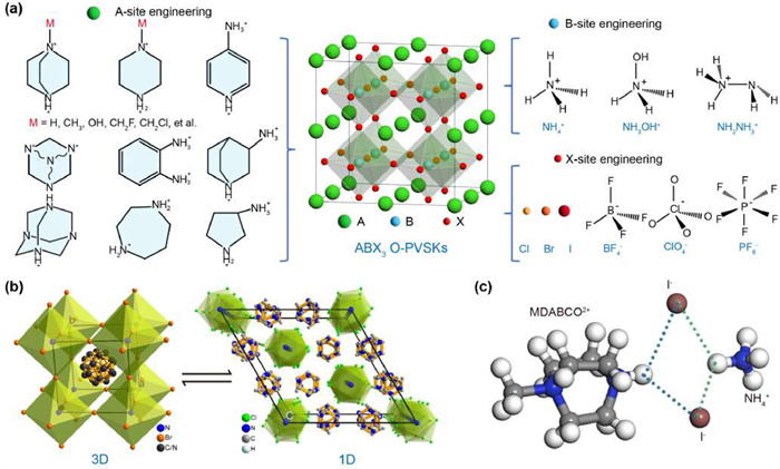| Fig. 2. Typical crystal structure of O-PVSKs. (a) The chemical/structural diversity of O-PVSKs. (b) The structural transition of DABCO—NH4X3 enabled by site engineering. Reproduced with permission [28]. Copyright 2018, The Authors, exclusive licensee AAAS. (c) Schematic illustration of hydrogen bonding in O-PVSKs. Reproduced with permission [33]. Copyright 2023, Wiley-VCH. | |