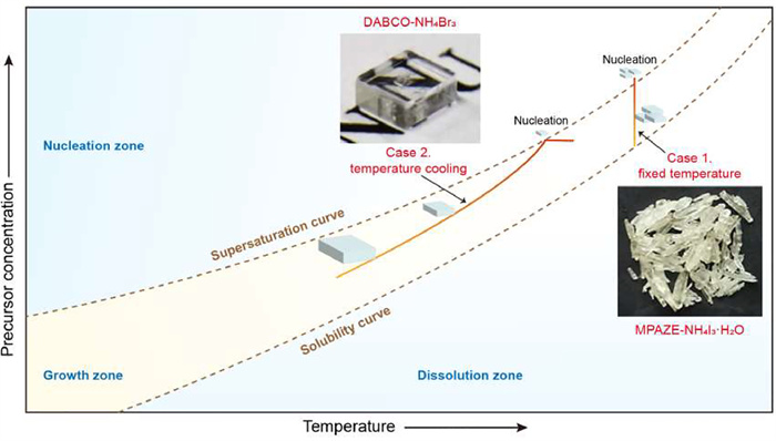 As a typical example, the first metal-free perovskite PAZE-NH4Cl3·H2O single crystal was spontaneously formed by mixing piperazine hexahydrate and NH4Cl in a aqueous solution and leaving the solution to evaporate at room temperature [27]. The universality of this solvent evaporation method was further validated by the successful synthesis of 23 kinds of O-PVSKs [28]. Of note, in this method, the temperature and initial concentration of the reactants are critical to crystal nucleation. For example, when a high temperature (-60 ℃) was applied to drive solvent evaporation, many small single crystals of MPAZE-NH4I3·H2O were formed due to excessive nucleation [33]. Similarly, a saturated solution (> 0.5 g/mL) of MDABCO—NH4I3, even at room temperature, led to excessive nucleation, subsequently with the formation of many small crystals. In this context, the precursor solution was diluted to 0.2–0.3 g/mL, and after 15 days' evaporation, only a few nuclei were formed. These nuclei continued to grow without the appearance of any new nuclei, giving rise to large crystals [31].