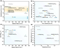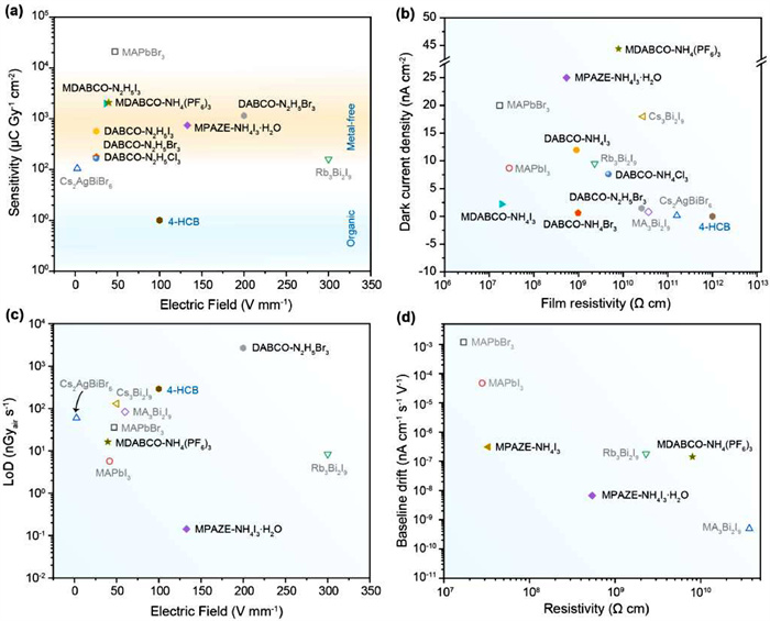 | Fig. 5. The key figures-of-merit of O-PVSKs X-ray detectors reported so far. (a) Sensitivity; (b) Dark current density; (c) Lowest limit of detection; (d) Baseline drift. | |