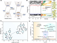 In addition, the electronic band structure of O-PVSKs regulated by A-site and B-site are investigated. Fig. 4b shows a typical band structure and DOS projected onto the components of MDABCO—NH4I3. The DOS and charge-density distribution clearly validates that the CBM predominately originate from the C and N states of MDABCO2+, while the contribution from the N states of NH4+ is negligible. Moreover, it is predicted that by substituting A-site with different lowest unoccupied molecular orbital (LUMO) energies, the bandgap of O-PVSKs can be tuned in a wide range of 0.8–4.0 eV (Fig. 4c) [65], though experimental verification remains to be done. By contrast, replacing NH4+ with N2H5+ at B-site exerts negligible effects on the electronic structure of O-PVSKs. This is evidenced by DABCO—N2H5Br3, whose VBM and CBM is dominated by Br− and DABCO2+, respectively [35].