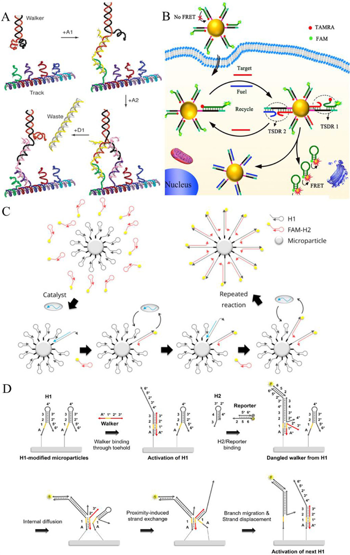 It was well-known that Pierce's group first presented the concept of DNA walker in 2004 [35], through designing a synthetic transport device which could mimic the movement of motor proteins. This bipedal DNA walker provided by Pierce's group realized real-time monitoring of walker movement via multiplexed fluorescence quenching. As shown in Fig. 2A, the DNA walker was attached to tracks by the attachment fuel strands (A1 and A2), and moved along tracks under the external control of detachment fuel strands (D). When the D1 hybridized with A1 by the toeholds-mediated strand displacement reaction, the walking leg was released and reattached to the adjacent tracks, resulting in moving along the tracks. Through the progressive movement, this DNA walker achieved the energy conversion by strand displacement reaction with no enzymes. In addition, Xiang's group [51] described a DNA-fueled machine for monitoring low-expressed microRNA (miRNA) in live cells (Fig. 2B). In the presence of target miRNA, the walker could release hairpin sequences from the dsDNA-conjugated gold nanoparticles. Through two cascaded strand displacement reactions, the DNA fuel strands assisted the recycling of the target miRNA sequences, resulting in the signal amplification. Obviously, this persistent walking mode driven by the strand displacement reaction required the addition of specific fuel strands, which leaded to the stable "trap state" formation. To prevent "trap states" formation, a metastable hairpin structure was provided as a fuel strand to propel the walker operation. Ellington's group [12] reported a stochastic DNA walker that traversed a microparticle surface (Fig. 2C). Through catalytic hairpin assembly to a microparticle surface, this novel DNA walker could be triggered by a ssDNA catalyst, due to the fact that the ssDNA could open the hairpin via toehold-mediated strand exchange, then the opened H1 hybridized to a toehold on H2, initiating branch migration. This robust walker could realize more than 30 continuous steps movement. Subsequently, as shown in Fig. 2D, Ellington's group [52] further reported a processive walker relying on a surface-immobilized proximity catalytic hairpin assembly. H1 was modified with biotin for the link to a streptavidin-coated microparticle. Meanwhile, H2 was designed as "fuel" strand that drove the moving. Spontaneous hybridization between H1 and H2 provided the potential of the walker to readily search out adjacent substrates. In conclusion, different from enzymatic process, strand displacement reaction could alter the sequence length and toehold complementarity regions, holding the capability to control and engineer the intelligent DNA walker.