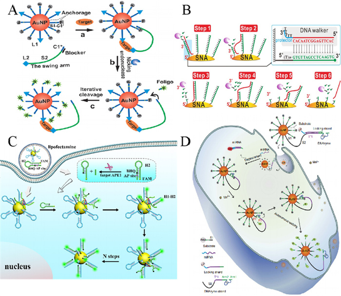 Streptavidin-coated microspheres having a spherical surface also could be regarded as nice 3D tracks. Through the streptavidin-biotin bind, the DNA strands could be modified on the surface of the streptavidin-coated microspheres. Xie's group [70] reported nicking endonuclease-powered 3D bipedal DNA walkers (BDW). The polystyrene microsphere was assembled with bipedal DNA walkers and fluorescence-labeled DNA strands. This BDW showed faster walking speed than single-legged DNA walker, and 70 min is enough for the reaction time. Meanwhile, this DNA walker have a wide linear range from 10 fmol/L to 5 nmol/L with a low detection limit of 5.2 fmol/L. Currently, Chu's group [71] also reported a DNAzyme walker, which was constructed by several DNAzyme walking strands and abundant FAM-labeled substrate strands on the surface of AuNP. This DNA walker could progressively walk along the tracks powered by DNAzyme-catalyzed substrate cleavage and realize intracellular miRNA image.