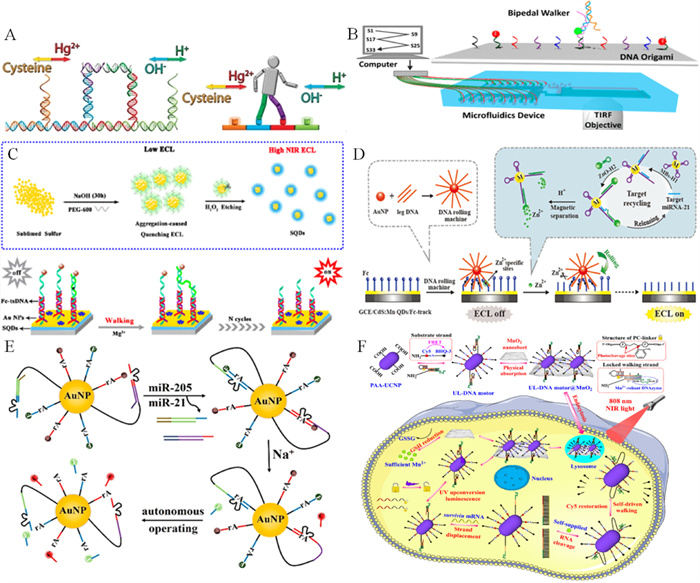 | Fig. 4. Schematic illustration of (A) bipedal walker activated by Hg2+/cysteine and H+/OH−. Reprinted with permission [43]. Copyright 2011, American Chemical Society. (B) Bipedal walker moving along the 2D DNA origami. Reprinted with permission [63]. Copyright 2017, American Chemical Society. (C) DSN enzyme-assisted target cycling amplification process. Reprinted with permission [65]. Copyright 2020, American Chemical Society. (D) The ECL biosensor based on a Zn2+-driven DNA rolling machine for speedy detection of miRNA-21. Reprinted with permission [67]. Copyright 2019, American Chemical Society. (E) Intracellular Na+-fueled DNAzyme motor differentiating cellular subtypes of non-small cell lung cancer. Reprinted with permission [55]. Copyright 2020, American Chemical Society. (F) UL-DNA motor@MnO2 for imaging survivin mRNA. Reprinted with permission [69]. Copyright 2022, American Chemical Society. | |