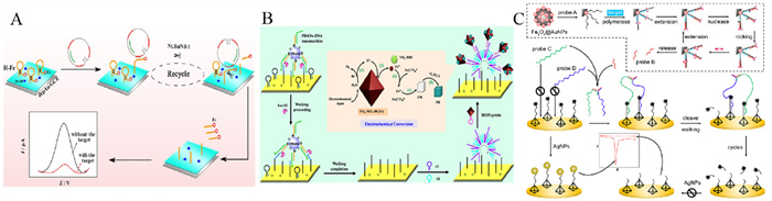 | Fig. 5. Schematic illustration of (A) an as-prepared electrochemical biosensor for the detection of miRNA-182–5p. Reprinted with permission [74]. Copyright 2021, American Chemical Society. (B) Biosensor of miRNA-21 based on PDANs-DNA walker and electrochemical conversion of MOFs. Reprinted with permission [75]. Copyright 2021, American Chemical Society. (C) The bipedal DNA walker based electrochemical genosensor. Reprinted with permission [77]. Copyright 2019, American Chemical Society. | |