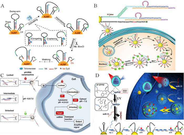 | Fig. 6. Schematic illustration of (A) telomerase-triggered DNA walker for detection of telomerase activity. Reprinted with permission [80]. Copyright 2019, American Chemical Society. (B) miRNA-triggered bipedal DNA walker. Reprinted with permission [81]. Copyright 2020, RSC. (C) PRPD walker for spatially controllable imaging of intracellular miRNA through the pH sensing triple DNA. Reprinted with permission [29]. Copyright 2022, American Chemical Society. (D) Photoactivatable DNA walker system for spatiotemporally resolved miRNA sensing. Reprinted with permission [85]. Copyright 2021, American Chemical Society. | |