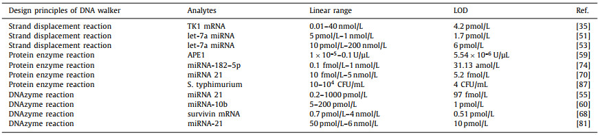 5. Conclusions and future perspectivesIn this review, we have comprehensively summarized the development of the DNA walkers, and their application in biosensor and bioimaging. Based on precise programmability and addressability, DNA walker with amplification strategies show high sensitivity, selectivity and motility for biomolecules, such as ions, nucleic acids, proteins, and bacteria, etc. Meanwhile, the detection limit of the most DNA walkers was relatively low, due to amplification capability, and high sensitivity for the target. However, the DNA walkers always remain some challenges for the researchers to develop more intelligent walker to complete complex tasks. First, it is of great significance to enhance the efficiency of DNA walker. Limiting by the ratio of the walking strands to the tracks, categories of driving forces and migration rate, the efficiency of DNA walker was relatively low. Currently, the researchers applied strategies to increase the ratio of the walking strands to the tracks, or change the ways of migration, developing rotating or rolling machine, and bipedal or multiple walker to improve the contact chance between the walking strands and the tracks, and reduce the interference from complex solution. Additionally, the design of the DNA walker including the structure of the DNA walker, the track, and the cleavage site also affect the efficiency. Second, the surface regulations of DNA walkers were also critical to improve walking speed, accuracy, efficiency, and biological applications. Generally, the sequences, length, and density of DNA probes affect spatial position resistance of the DNA assemblying on the vector surface, favorable to improve high anti-interference capacities of the DNA walker-based nanosystems, which were beneficial to the development of novel and highly efficient DNA walker. In addition, the type and size of DNA vectors also affect the DNA assemblying on the surface, thereby influence the operating efficiency of the DNA walker.