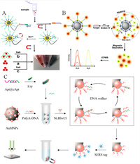 Additionally, SERS possesses the advantages of extremely narrow peak width, high sensitivity multivariate detection ability and wide dynamic range (Fig. 7C). Recently, Duan's group [89] developed a 3D DNA walker based on the SERS strategy for quantitative analysis of Salmonella typhimurium (S.ty). This DNA walker taking AuNPs modified magnetic nanoparticles as 3D walking surface, could be triggered by the complementary DNA of S.ty-recognizing aptamer replaced from the double-stranded DNA (dsDNA) of Apt@cApt reacting with S.ty. Under the driving force of nicking endonuclease, this system could induce the SERS signal. This DNA walker showed highly selective and sensitive method for the S.ty detection, achieving the signal amplification, presenting new methods for SERS assay of biomaterials.