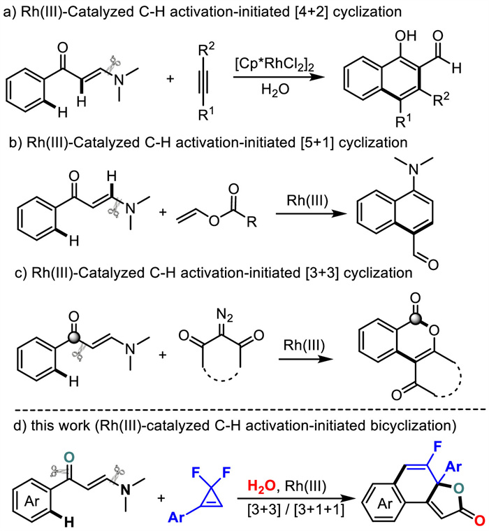 The constant search for pharmaceutical candidates has strengthened the demand for developing new chemical technology that can rapidly access highly functionalized molecules and their derivatives from simple and easily available precursors. One useful but challenging strategy is to cleave different chemical bonds and reassemble them to yield complex molecules, and thus such methods are particularly appealing in combinatorial campaigns to diversify a fragment pool [1-6]. Among them, Rh(Ⅲ)-catalyzed C(sp2)—H activation-initiated annulation reactions have recently emerged as a powerful tool to fabricate valuable highly functionalized cyclic compounds with step- and atom-economy and have received increasing attention [7-14]. Typically, the vast majority of these transformations involve activation of C—H bonds, insertion of coupling partners and in situ conversion of the corresponding directing group to deliver various heterocycles and fused rings. Despite great advances gained in this field, developing a new and practical Rh(Ⅲ)-catalyzed C—H activation-initiated cyclization to access cyclic structures is highly desirable, given the significance of enriching organic reaction toolboxes to generate functionalized molecules and the potential of using these molecules for downstream studies in medicinal chemistry.