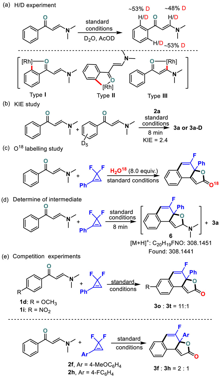 Further investigations were then performed to gain more insight into the mechanism of this transformation (Scheme 4). First, in the H/D exchange study, without 2a, the reaction of 1a in CH3CO2D under standard reaction conditions gave 53% deuteration at the ortho-positions of aryl enaminone 1a and 48% deuteration at the N-linked C(sp2)—H bond through three different five-membered rhoda-cycles (Scheme 4a), revealing that C—H bond activation was a reversible process. Subsequently, a deuterium labelling experiment was conducted to display a significant kinetic isotope effect (KIE, KIE = 2.4) in an intermolecular competitive coupling of an equimolar mixture of 1a and [D]-1a with 2a (Scheme 4b), demonstrating that C—H bond cleavage may be the rate-determining step. To confirm the two oxygen sources from the ester, H218O was subjected to the reaction of 1a with 2a under standard conditions, and product 3a incorporating 18O atom was observed by HRMS (Scheme 4c), supporting that for the ester group, one oxygen atom comes from water and the other comes from intramolecular transfer of enaminone. Moreover, intermediate 6 could be detected by HRMS analysis when the reaction was performed for 8 min under standard conditions (Scheme 4d). To understand the reactivity of N, N-dimethyl enaminones and gem-difluorocyclopropenes, two intermolecular competitive reactions were performed (Scheme 4e), revealing that enaminone with an electronically rich group to access the targets was strongly favored over an electronically poor group and that electron-rich gem-difluorocyclopropenes proceed with the required coordination and carbometallation more easily.