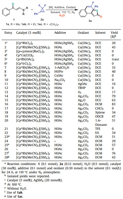 We commenced our investigation on the reaction with N, N-dimethyl enaminone 1a and gem-difluorocyclopropene 2a in DCE in the presence of H2O at 110 ℃ under a N2 atmosphere by using [Cp*RhCl2]2 (Cp* = pentamethylcyclopentadienyl) as a catalyst, AgSbF6 and HOAc as additives, and Cu(OAc)2 as an oxidant (Table 1, entry 1). An initial attempt gave desired product 3a in 20% yield. Other catalysts commonly used in C(sp2)—H activation reactions, such as [Cp*Rh(CH3CN)3](SbF6)2, [RuCl2(p-cymene)]2, [Cp*Co(CO)I2], Cp*Rh(OAc)2 and [Cp*IrCl2]2, were screened in this catalytic system (entries 2−6). The results indicated that the former demonstrated a higher catalytic ability, enhancing the yield to 43% (entry 2); in sharp contrast, the latter four completely inhibited the reaction process, and no desired product was observed. Taking [Cp*Rh(CH3CN)3](SbF6)2 as the catalyst, other reaction parameters, including the additive, oxidant, solvent and reaction temperature, were investigated to further improve the efficiency of this transformation. Exchanging HOAc for 1-adamantanecarboxylic acid (1-AdCO2H) or pivalic acid (HOPiv) could drive this reaction but lowered the yield of 3a (entries 7 and 8). When using CsOAc or Na2CO3 as the base, this reaction did not proceed (entries 9 and 10), showing that the acids as additives are beneficial for this transformation whereas the bases suppressed this reaction process. Next, different oxidants, namely AgOAc, tert-butyl hydroperoxide (TBHP), O2, Ag2CO3, and Ag2O, were tested (entries 11–15): the former three displayed poor oxidative performances, and their use in fact dramatically suppressed the formation of 3a (entries 11–13); in contrast, and to our delight, the latter two oxidants drove this reaction to work more efficiently, delivering higher yields of 3a (entries 14 and 15), compared with Cu(OAc)2—and of these two oxidants, Ag2CO3 proved to be a better choice for this domino process (79%, entry 14). After that, the yields of product 3a associated with [Cp*Rh(CH3CN)3](SbF6)2 in the presence of HOAc and Ag2CO3 in several other aprotic solvents were summarized as follows (entries 16–22): dichloromethane (DCM, 83%), CHCl3 (9%), xylene (34%), orthodichlorobenzene (ODCB, 47%), 1, 4-dioxane (51%), 2, 2, 2-trifluoroethanol (TFE, 0%), and ethyl acetate (EA, 34%), among which DCM gave a higher yield than other solvents (entry 16). Reducing the reaction temperature led to an incomplete consumption of starting materials, lowering the yield to 51% (entry 23). Without HOAc or H2O, the yield of 3a severely declined to 29% and 57% respectively (entries 24 and 25), showing that additional water is necessary for this transformation. The reaction did not proceed in the absence of the Rh catalyst (entry 26). Moreover, N, N-diethyl (1ab) and pyrrolidin-1-yl (1ac) enaminones were chosen to examine the effect of substituents linked by nitrogen atoms on the efficiency of the transformation. The results revealed that the target compound 3a could be generated, but with decreased yields (entries 27 and 28).