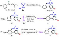 To showcase the potential application of this bicyclization protocol, the scale-up synthesis and derivatization reactions were performed (Scheme 3). The reaction proceeded efficiently on a 7.0 mmol scale of 1a, albeit with a slightly decreased yield (63%, Scheme 3a). Furthermore, by utilizing the bromo handles, Sonogashira coupling reaction was elaborated with 4a yield of product 4 (Scheme 3b). Next, nitro reduction of 3t in the presence of Fe and NH4Cl and the subsequent sulfonylation of TsCl afforded product 5 in 41% yield (Scheme 3c).