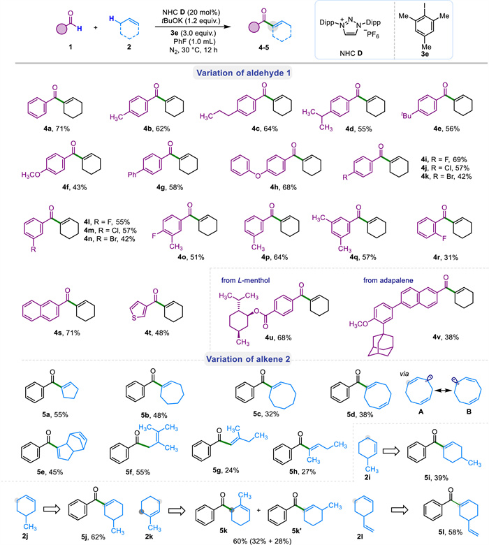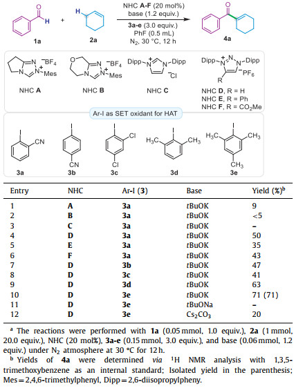 Based on our hypothesis, we initiated our study on the dehydrogenative coupling reaction with benzaldehyde (1a) and cyclohexene (2a) as the model substrates (Table 1). Classical triazolium NHC catalysts A-B were first chose by employment of ortho-cyanoiodobenzene (3a) as the single-electron oxidant to test our synthetic strategy. Gratifyingly, both reactions afforded the desired coupling product 4a, albeit in relatively poor yield (entries 1 and 2). While imidazoline NHC C failed to give the product, NHC D-F featuring a mesoionic scaffold [65-69] furnished the desired product 4a in a significantly improved yield, probably owing to the strong reduction potential of the deprotonated Breslow Intermediates (BIs) derived from mesoionic carbene (MIC) (entries 4–6). Considering the pivotal role of the oxidant 3 in the radical generations, we then turned our effort to examine the effect of various aromatic iodides to achieve a more efficient catalytic system for the coupling reaction (entries 7–10). We were pleased to find that the use of a sterically hindered iodide 3e was superior to provide the coupling product 4a in 71% yield (entry 10), which probably suppressed the undesired reaction pathway triggered by the aryl radicals. Other bases, like NatBuO and Cs2CO3 (entries 11 and 12, see Table S2 in Supporting information for details), were also investigated, which could not give better results. Notably, the big difference between reactions with tBuOK and tBuONa might be owing to the poor solubility of tBuONa in the reaction medium (PhF), which would decrease its basicity to form the key deprotonated Breslow intermediate.