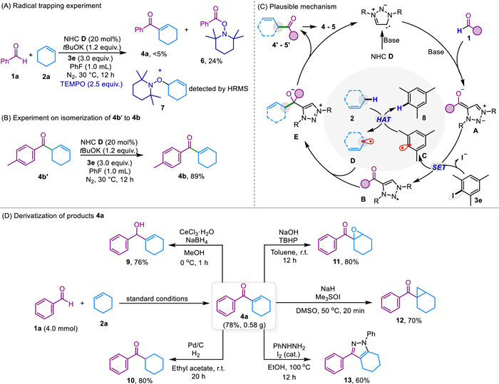 A TEMPO-trapping experiment was carried out to shed insights on the plausible reaction mechanism. Three equivalents of TEMPO were added to the catalytic conditions as illustrated in Scheme 2A. The desired dehydrogenative coupling reaction was significantly suppressed with product 4a afforded in less than 5% yield. Radical trapping adducts with aldehyde (6), and cyclohexene (7) were successfully detected that supports the proposed radical pathway. In addition, a migration of double bond from the allylic ketone 4b' was observed by subjection of 4b' under the catalytic conditions for 12 h, leading to the desired enone product 4b in 89% yield (Scheme 2B). Built upon these experiments and the substrate scope with substituted cyclohexenes, as well as our and others' previous reports [54,56,57,65], a plausible mechanism for the carbene-catalyzed enone synthesis was proposed in Scheme 2C. Firstly, deprotonated Breslow intermediate A underwent a single-electron oxidation by aromatic iodide 3e, which led to carbene-bound radical B and aryl radical C. Subsequently, hydrogen atom transfer (HAT) between species C and alkene 2 facilely occurred, giving rise to arene 8 and allyl radical D. Further radical-radical coupling with the persistent catalyst-bound radical species B would eventually afford the desired enone products 4–5 after migration of the double bond in ketone 4′−5′ and elaborated the NHC catalyst for the next catalytic cycle.