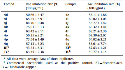 Table 2 In vitro antibacterial activity of the target compounds against Xoo and Xac.a |