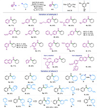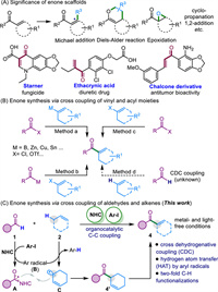 Enones (or α, β-unsaturated ketones) represent a fundamental scaffold in organic synthesis for a broad spectrum of synthetic transformations, such as Michael additions, Diels-Alder reactions, epoxidations (Fig. 1A) [1-12]. Notably, the enone functionality is also ubiquitous in various natural products, pharmaceuticals and biologically active molecules [13-16]. A diverse set of strategies have been developed for the efficient synthesis of enones, such as aldol or Knoevenagel condensation, Wittig olefination, dehydrogenation of ketones [17-20]. Recently, cross-coupling reactions between vinyl and acyl moieties by means of transition metal catalysis has been intensively explored that offers an efficient approach for rapid assembly of α, β-unsaturated ketones. In this context, most of these transformations relied on the cross couplings of acyl electrophiles with vinyl metallic reagents as the partners that were enabled by palladium, copper or other metal catalysis (Fig. 1B, method a) [21-26]. Alternatively, direct coupling between vinyl triflate with acyl metallic reagent as nucleophile has been achieved, as reported by Lee and co-workers (Fig. 1B, method b) [27]. In addition, the enone synthesis via cross couplings could also be realized between two electrophiles. For instance, Shu group demonstrated an elegant enone synthesis from acyl fluorides and vinyl triflates by a reductive nickel catalysis (Fig. 1B, method c) [28]. Although the metal-catalyzed coupling reactions are highly effective and synthetically useful to provide a wide range of enone derivatives, the requirement of pre-installed C–(pseudo)halide or C–metal reagents has diminished its efficiency in atom and step economy. The strategy by cross dehydrogenative coupling (CDC) [29-35] of simple aldehydes and alkenes without additional prefunctionalization thereby represents as a highly appealing approach for enone synthesis, which to our knowledge, is not achieved yet (Fig. 1B, method d).
