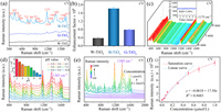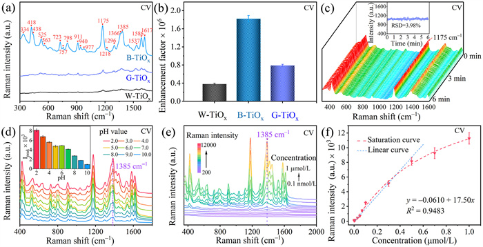 | Fig. 2. (a) Raman spectra of CV at W-TiOx, B-TiOx and G-TiOx. (b) The corresponding histogram of enhancement factors. (c) Stability of the B-TiOx substrate with CV molecule for 6 min continuous laser radiations (Inset: The RSD at 1175 cm−1 with time). (d) pH response on the extraction (Inset: The Raman intensity at 1385 cm−1 with pH). (e) SERS spectra of characteristic peak vs. different concentration of CV (1 µmol/L−0.1 nmol/L). (f) The corresponding adsorption curves and the calibration curves. | |