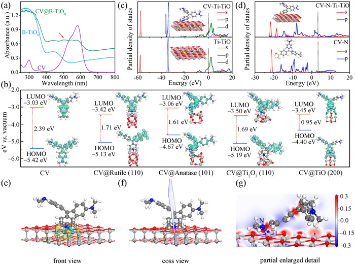 | Fig. 3. (a) UV–vis absorption spectra of CV, B-TiOx, and CV@B-TiOx. (b) Energy level diagram of the HOMO and LUMO of CV, CV@Rutile (110), CV@Anatase (101), CV@Ti2O3 (110) and CV@TiO (200) for CV@B-TiOx. PDOS calculation for TiO (200) surfaces absorbed by CV, including Ti-TiO and CV-Ti-TiO (c), and CV-N and CV-N-Ti-TiO (d). Differential charge density distribution of front view (e), coss view (f) and partial enlarged detail (g) for CV-Ti-TiO site of CV@B-TiOx, the red (blue) distribution illustrates electron accumulation (depletion) of N-Ti site. | |