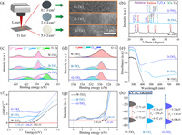| Fig. 1. (a) Schematic diagram of TiO2-x/Ti nanostructures synthesized by laser and corresponding FESEM images. (b) XRD patterns of TiO2-x/Ti prepared with different laser fluences. (c) Ti 2p and (d) O 1s spectra of W-TiOx, B-TiOx and G-TiOx in XPS analysis. (e) UV–vis curves, the corresponding plots of (F(R)E)1/2 (f), UPS spectra (g) and the proposed band structure (h) for W-TiOx, B-TiOx, and G-TiOx. | |