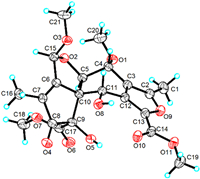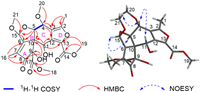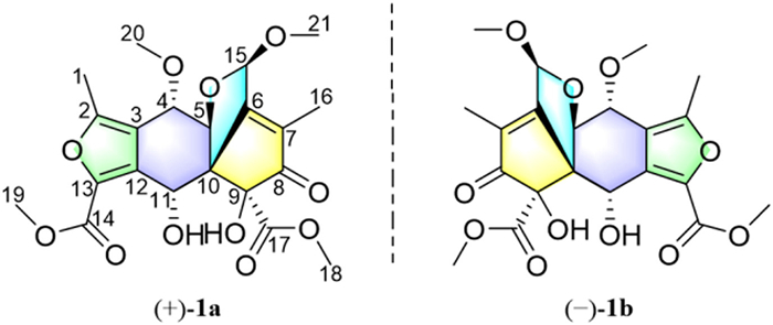 The planar structure of 1 was established by 2D NMR analysis (Fig. 2). The 1H−1H correlation spectroscopy (COSY) spectrum revealed connectivity of H-4/H-5. This fragment was further connected with hydrogen-free tertiary carbons and functionalities by detailed heteronuclear multiple-bond correlation (HMBC) analysis. The HMBC associations from an olefinic methyl singlet (H3–16) to two hydrogen-free sp2 carbon (C-6 and C-7) and a ketocarbon (C-8) linked C-6, C-16, and C-8 to C-7. The HMBC associations from 9-OH to an oxygenated quaternary carbon (C-9), a sp3 quaternary carbon (C-10), an ester carbonyl (C-17), and C-8 linked C-10, C-17, and C-8 to C-9. Two methoxy groups were connected to C-17 and an acetal carbon (C-15), respectively, by HMBC associations from H3–18 to C-17, and from H3–21 to C-15. Moreover, The HMBC associations from H-15 to C-6 linked C-15 and C-6, while an oxygenated methine (C-5) was connected to C-6 via C-10 by HMBC associations of H-5/C-10, C-15 and C-6. The above connections generated a 5/5 (A/B) fused ring system. In addition, the oxygenated methine hydrogen (H-11) was observed in the HMBC spectrum to correlated with C-10 and a hydrogen-free sp2 carbon (C-12), suggesting the connectivities of C-10 and C-12 via C-11, while another oxygenated methine (C-4) was connected to C-12 via a hydrogen-free sp2 carbon (C-3) by HMBC associations of H-4/C-3, and C-12. Therefore, a six-membered carbon C-ring was established, sharing C-5 and C-10 with ring B. A methoxyl was located at C-4 by HMBC associations from H3–20 to C-4. On the basis of the degree of unsaturation and the HMBC associations from an olefinic methyl singlet (H3–1) to two hydrogen-free sp2 carbon (C-2 and C-3), from a methoxyl singlet (H3–19) to an ester carbonyl (C-14) and a hydrogen-free sp2 carbon (C-13), and from H-11 to C-13, the furan ring D was then built. To sum up, the planar structure of 1 with an unusual 5/5/6/5 fused ring system was established.