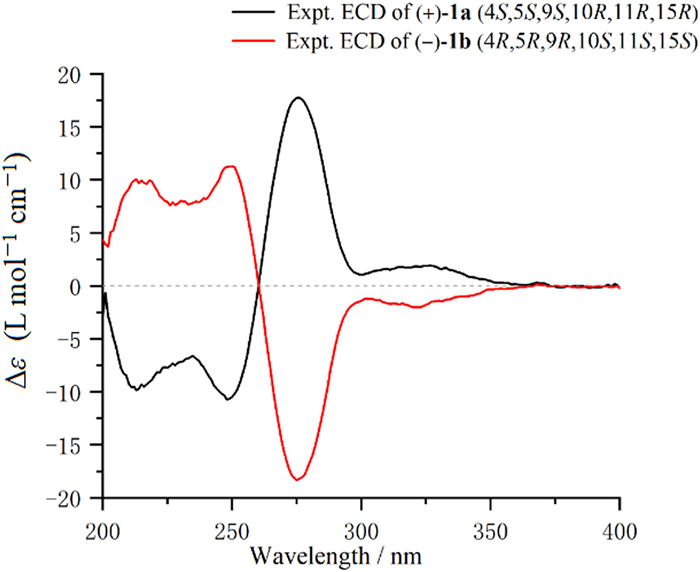 Fortunately, the qualified single crystal of (−)−1b was acquired [Flack parameter of 0.01(11)], which defined the absolute configuration of (−)−1b (Fig. 3). Combined with the experimental electronic circular dichroism (ECD) spectra (Fig. 4), the absolute configurations of (+)−1a and (−)−1b were unambiguously identified as 4S, 5S, 9S, 10R, 11R, 15R and 4R, 5R, 9R, 10S, 11S, 15S, respectively.