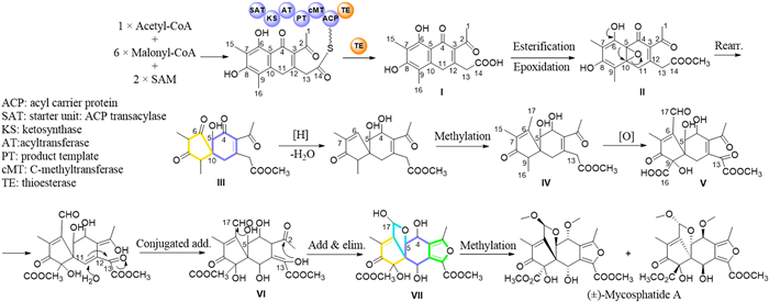 First, one acetyl-CoA, six malonyl-CoA and two S-adenosyl-l-methionine (SAM) molecules as starter substrates are condensed under polyketide synthase [15,16], then intermediate I is generated catalyzing by the thioesterase (TE) domain [17], which via esterification and epoxidation between C-5 and C-10 forms intermediate II. The rearrangement reactions in intermediate II generates a spiro[4.5]decane scaffold (key intermediate III). After that, a further reduction and dehydration of III followed by methylation [18] affords an intermediate IV, which undergoes a series of oxidation at C-9, C-16, C-17 and C-13 to yield intermediate V. Subsequently, the enol interconversion in V followed by 1,4-conjugated addition between H2O and the α, β-unsaturated ketone (C-11 to C-13) generates intermediate VI, which ultimately constructed a 5/5/6/5 fused tetracyclic intermediate VII through two simultaneous nucleophilic additions. Finally, the (±)-mycosphatide A is formed through methylation reactions [18].