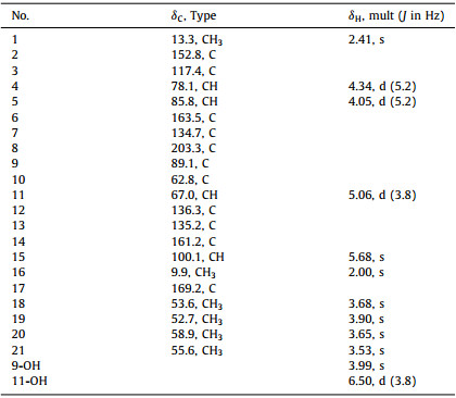 Mycosphatide A (1), which has the form of colorless needles, has a molecular formula of C21H24O11, as deduced by high-resolution electrospray ionization mass spectrometry (HRESIMS) ([M + Na]+ m/z 475.12123, calcd. 475.12108), corresponding to 10 degrees of unsaturation (DOUs). The 1H nuclear magnetic resonance (NMR) data (Table 1) revealed two singlet methyls [δH 2.00 (s, H3–16) and 2.41 (s, H3–1)], four singlet methoxyls [δH 3.53 (s, H3–21), 3.65 (s, H3–20), 3.68 (s, H3–18) and 3.90 (s, H3–19)], four oxygenated methines [δH 4.05 (d, J = 5.2 Hz, H-5), 4.34 (d, J = 5.2 Hz, H-4), 5.06 (d, J = 3.8 Hz, H-11), and 5.68 (s, H-15)], and two hydroxy groups [δH 3.99 (s, 9-OH) and 6.50 (d, J = 3.8 Hz, 11-OH)]. The 13C and heteronuclear single quantum coherence (HSQC) spectra indicated the presence of 21 carbon signals, including one ketone carbonyl (δC 203.3), two ester carbonyls (δC 161.2, and 169.2), six sp2 quaternary carbons (δC 117.4, 134.7, 135.2, 136.3, 152.8, and 163.5), two sp3 quaternary carbons [δC 62.8, and δC 89.1 (oxygenated)], four oxygenated methines (δC 67.0, 78.1, 85.8, and one acetal carbon at δC 100.1), four methoxyls (δC 52.7, 53.6, 55.6, and 58.9), and two methyls (δC 9.9 and 13.3).