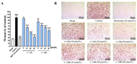 | Fig. 5. TG-lowering efficacy of (+)−1a and (−)−1b in 3T3-L1 cells. (A) TG levels under the treatments of (+)−1a and (−)−1b with different concentrations. (B) Representative ORO staining photomicrographs under the treatment of (+)−1a and (−)−1b with different concentrations. Blank: undifferentiated cells; control: differentiated cells without compound treatment. Data represented the mean ± standard deviation (SD) of at least three independent experiments. |||P < 0.001 vs. the blank group; **P < 0.01, ***P < 0.001 vs. the control group. | |