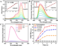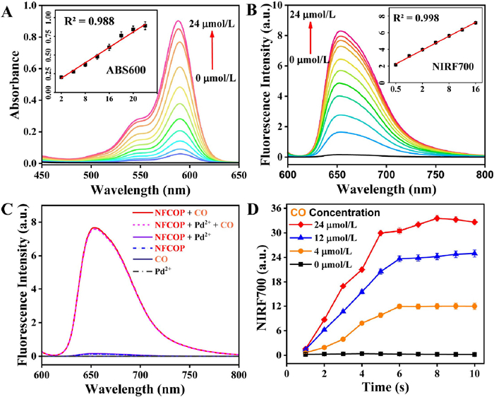 | Fig. 1. (A) Fluorescence spectra of NFCOP after different treatments. (B) The plot of NIRF intensity at 700 nm of NFCOP treated with different concentrations of CO. (C) The UV–vis absorption spectra and (D) FL spectra of NFCOP solutions with different CO concentrations. | |
