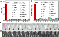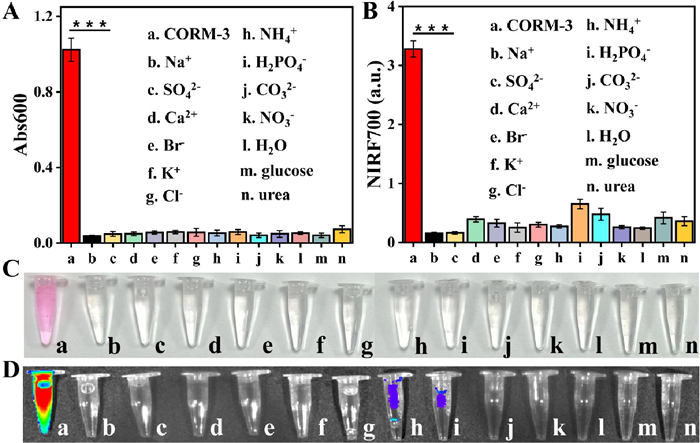 | Fig. 2. (A) The Abs600 and (B) NIRF700 of NFCOP in the presence of different analytes (mean ± SD, n = 3). ***P < 0.0005. (C) Photograph of NFCOP before and after reaction with different analytes. (D) NIR images of NFCOP in the presence of different analytes (a. CORM-3, b. Na+, c. SO42−, d. Ca2+, e. Br−, f. K+, g. Cl−, h. NH4+, i. H2PO4−, j. CO32−, k. NO3−, l. H2O2, m. glucose, n. urea). | |