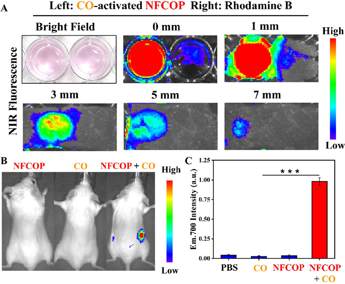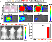 | Fig. 4. (A) NIR imaging was performed at 37 ℃ with different thicknesses of chicken tissue overlay (CO-activated NFCOP on the left, rhodamine B on the right). (B) Representative NIRF700 images (λex = 600 nm). (C) The corresponding NIRF700 intensity changes of mice toward different treatments (mean ± SD, n = 3). ***P < 0.0005. | |