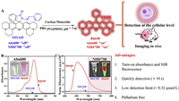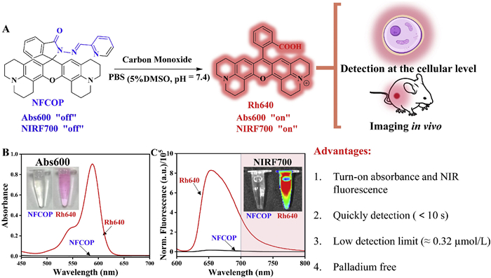 | Scheme 1. (A) Illustration of NIRF turn-on response of NFCOP for CO detection. (B) Absorbance and (C) fluorescence emission spectra of NFCOP (24 µmol/L) after treatment with CO (the concentration of CORM-3: 24 µmol/L, dissolved in the 5% DMSO of water, pH 7.4, reaction time: 30 s). | |