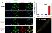 | Fig. 3. (A) Confocal fluorescence images of CO in Panc02 cell by the treatment of NFCOP, scale bar: 20 µm. (B) NIRF700 intensity of the red channel (mean ± SD, n = 3). ***P < 0.0005. (C) Intensity scatter plot of green and red channels. | |