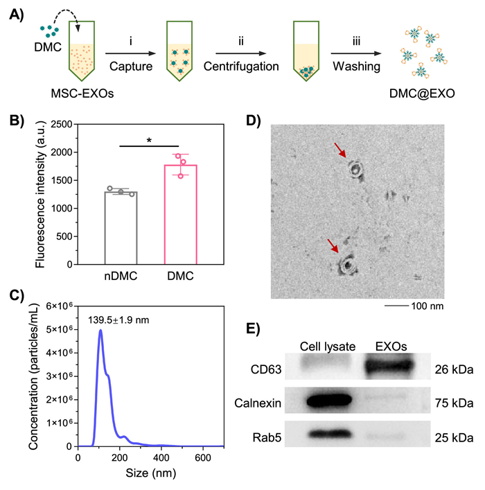 | Fig. 2. Separation of MSC-EXOs by DMCs. (A) Schematic illustration of the separation process of MSC-EXOs by DMCs. (B) Statistics of fluorescence intensity of the EXOs captured by nDMCs and DMCs. nDMCs, DMCs without aptamer. Statistical analysis was performed using by two-tailed unpaired t-test. Data were presented as mean ± S.D. (n = 3 independent samples). *P < 0.05. (C) Nanoparticle tracking analysis of EXOs. (D) Transmission electron microscopy image of EXOs. (E) Representative bands of Western blot assay for exosomal markers (CD63) and non-exosomal markers (calnexin and Rab5). | |
