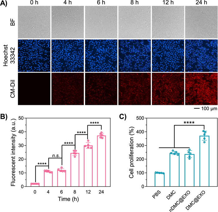 | Fig. 3. Enhancement of cell migration verified by transwell assay. (A) Representative fluorescence microscopy images to observe the internalization of CM-DiI-stained EXOs by SMCs. (B) Statistical analysis of fluorescence intensity in (A). (C) Cell counting kit-8 assay to investigate the influence of MSC-EXOs separated by DMCs on the proliferation ability of cells. Statistical analysis was performed using ordinary one-way ANOVA. Data were presented as mean ± S.D. (n = 5 independent samples). n.s., P > 0.05; ****P < 0.0001. | |