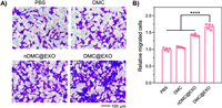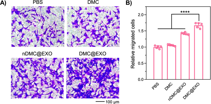 | Fig. 4. Enhancement of cell migration verified by transwell assay. (A) Representative microscopy images of the SMCs treated with PBS, DMC, nDMC@EXO and DMC@EXO, respectively. SMCs were treated by crystal violet staining before imaging. (B) Statistics of the migrated cells in the transwell assay. Statistical analysis was performed using ordinary one-way ANOVA. Data were presented as mean ± S.D. (n = 5 independent samples). ****P < 0.0001. | |