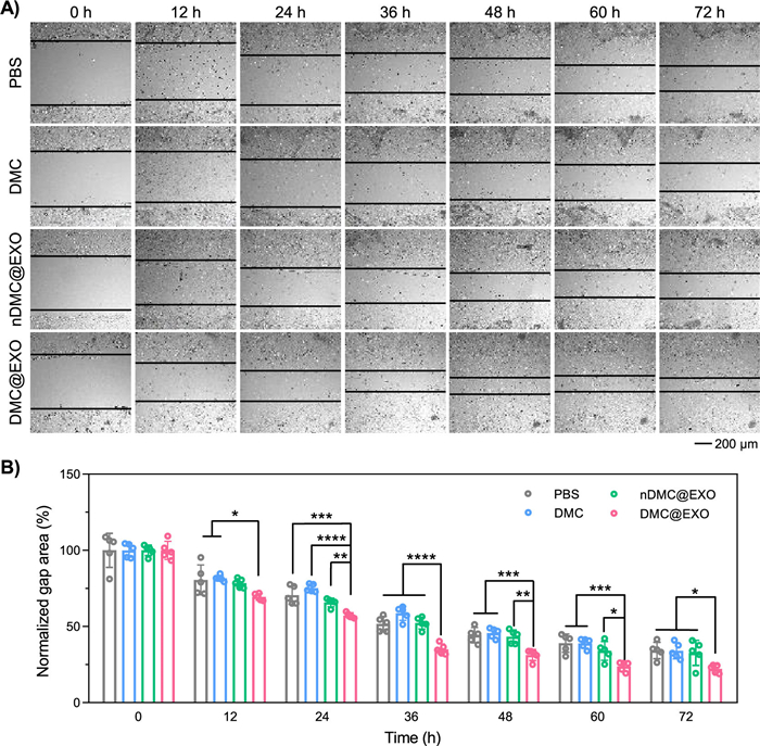 | Fig. 5. Enhancement of cell migration verified by scratch assay. (A) Microscopy images of the scratches treated with PBS, DMC, nDMC@EXO and DMC@EXO, respectively. (B) Statistics of gap area in the scratch assay. Statistical analysis was performed using ordinary one-way ANOVA. Data were presented as mean ± S.D. (n = 5 independent samples). *P < 0.05, **P < 0.01, ***P < 0.001, ****P < 0.0001. | |