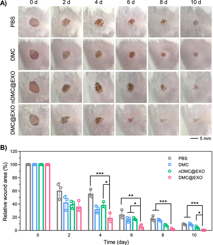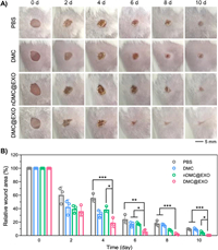| Fig. 6. Promotion of wound healing in full-thickness wound excision mouse models. (A) Pictures of the wounds treated with PBS, DMC, nDMC@EXO and DMC@EXO, respectively. (B) Statistics of wound area in (A). Statistical analysis was performed using ordinary one-way ANOVA. Data were presented as mean ± S.D. (n = 5 independent samples). *P < 0.05, **P < 0.01, ***P < 0.001. | |
