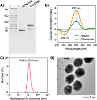 | Fig. 1. Synthesis and characterization of DMCs. (A) 12% native polyacrylamide gel electrophoresis to verify the cyclizing of template. (B) Circular dichroism spectra of aptamer and the complementary sequence of linear template (CS-template). (C) Dynamic light scattering assay of DMCs. (D) Transmission electron microscopy image of DMCs. | |