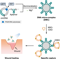 | Scheme 1. Schematic illustration of DNA micro-complex (DMC) for exosome (EXO) separation and wound healing. The DMCs were constructed via the biomineralization process in rolling circle amplification with the catalysis of phi29 DNA polymerase. The polyvalent aptamers in DMCs specifically captured EXOs by recognizing the CD63 proteins on the membrane. circDNA, circular DNA; dNTP, deoxyribonucleoside triphosphate; PPi4+, pyrophosphate group; MSC, mesenchymal stem cell. | |